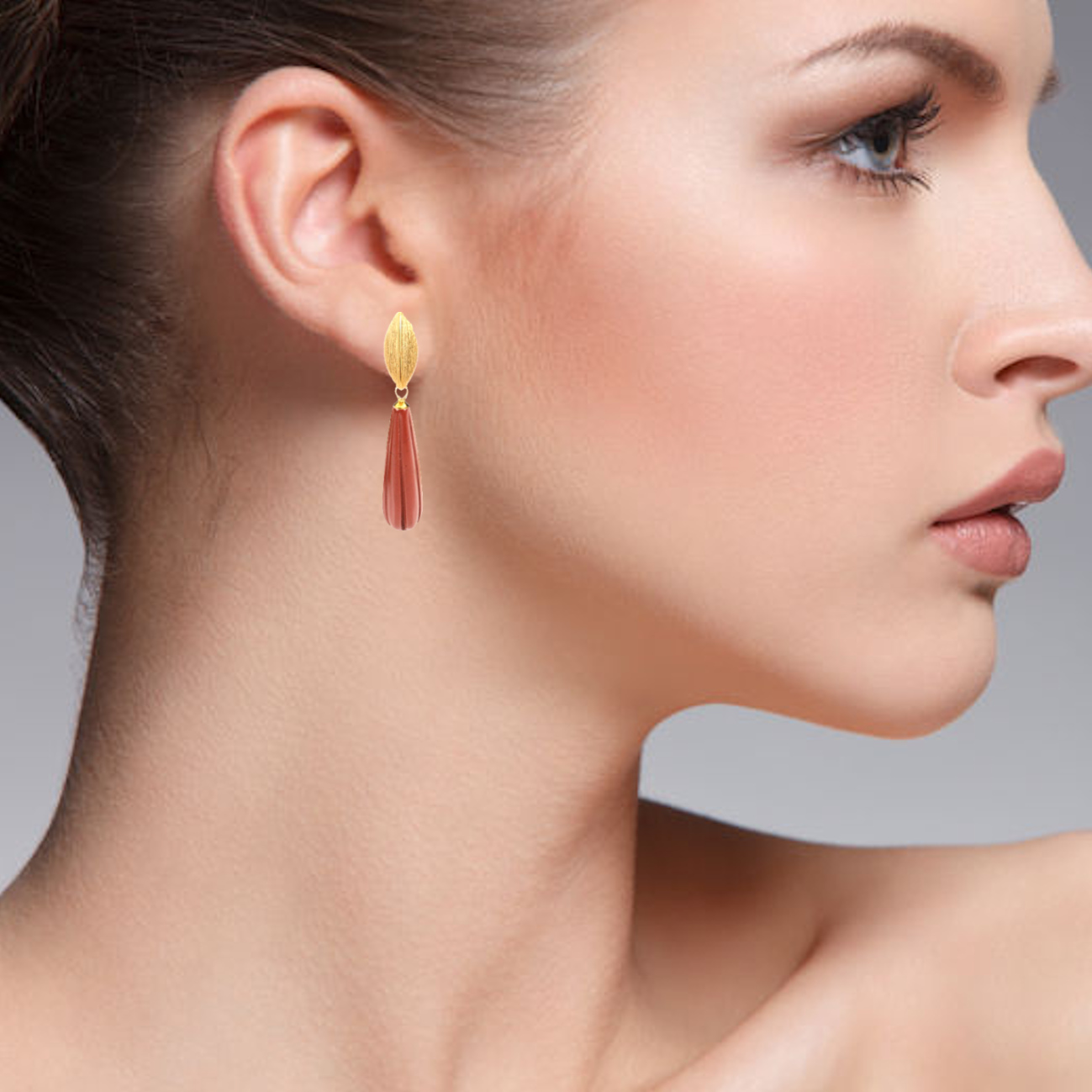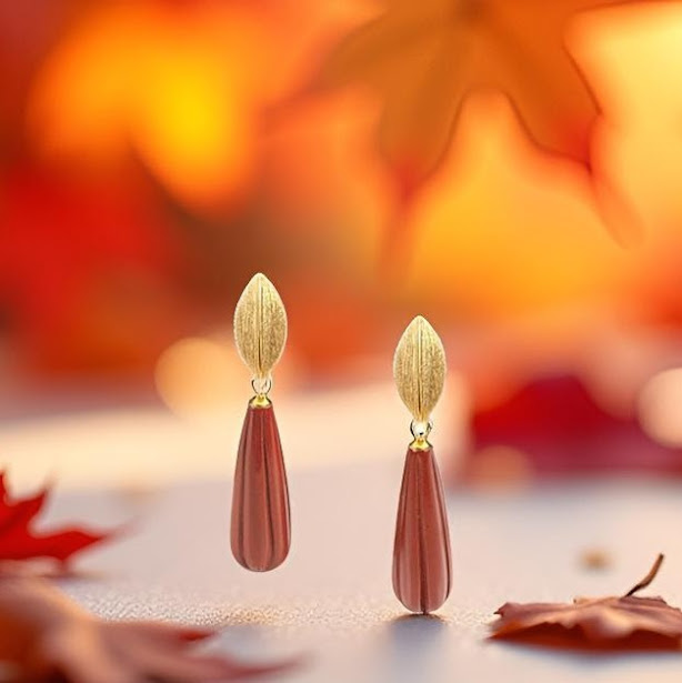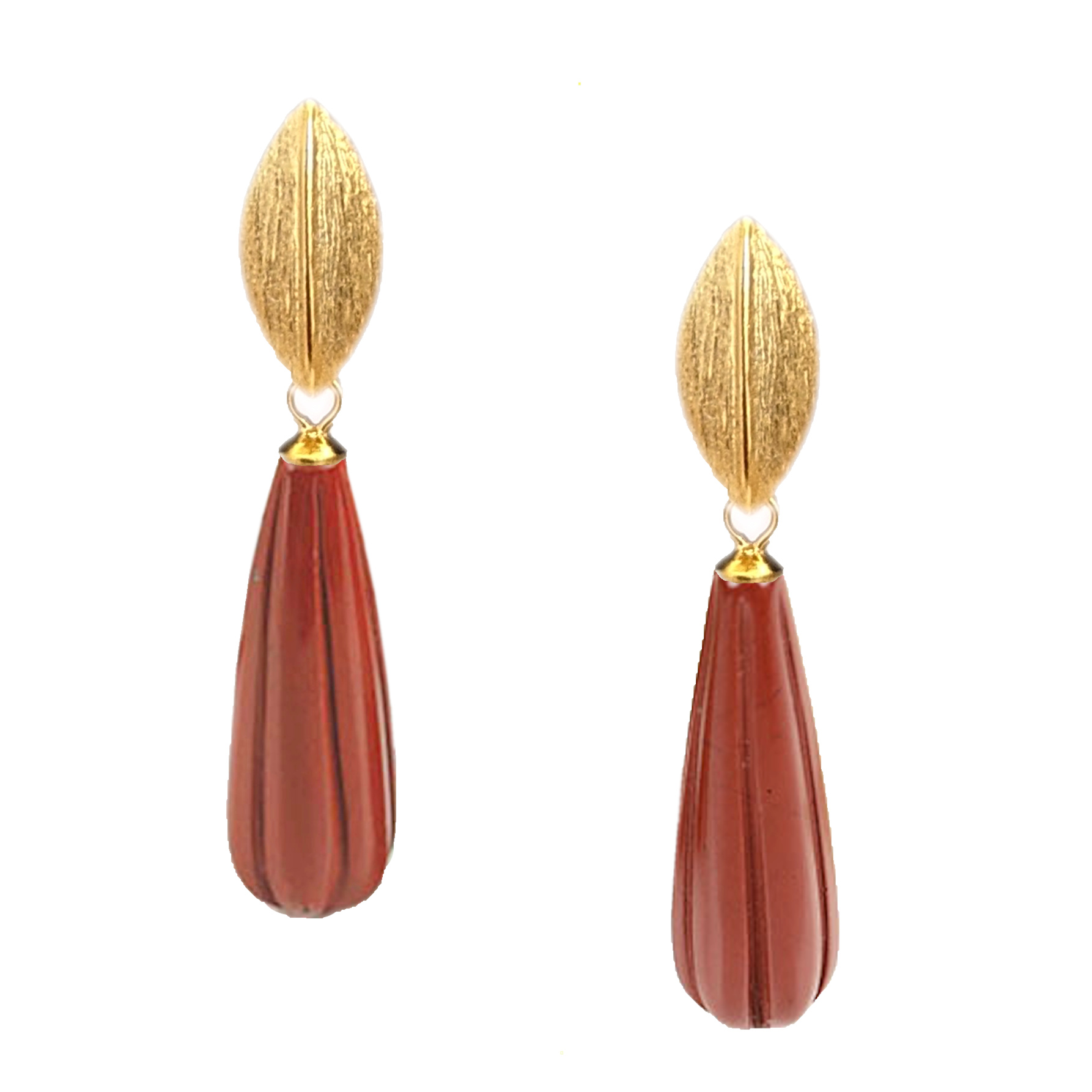 Diese exquisiten Ohrstecker vereinen edles Design mit hochwertiger Handwerkskunst. Gefertigt aus 925er Sterling Silber mit einer vergoldeten Oberfläche, präsentieren sie sich in einer bezaubernden Blattform. Der besondere Blickfang ist der kunstvoll gravierte Anhänger aus rotem Jaspis, der in einer eleganten länglichen Form von 22 mm x 7 mm gestaltet ist. Das filigrane Blattmotiv am oberen Teil misst 12 x 6 mm und verleiht den Ohrringen eine natürliche, florale Eleganz. Die gebürstete Oberfläche des Silbers schafft einen wunderschönen Kontrast zum warmen Rot des Jaspis.